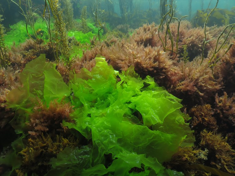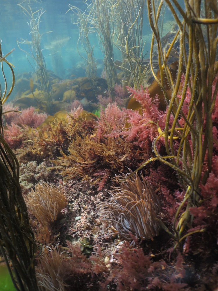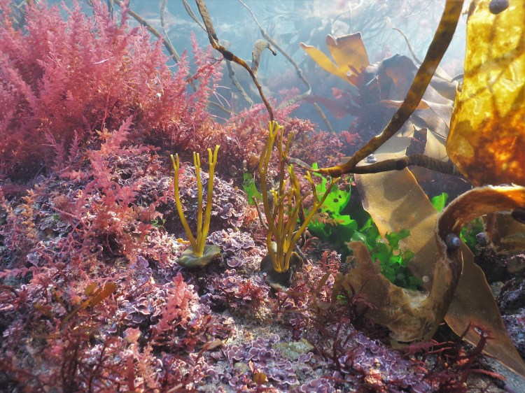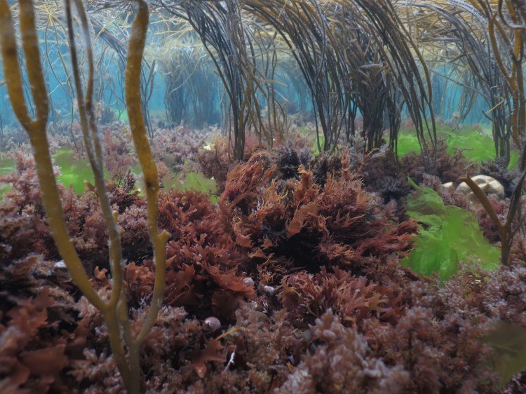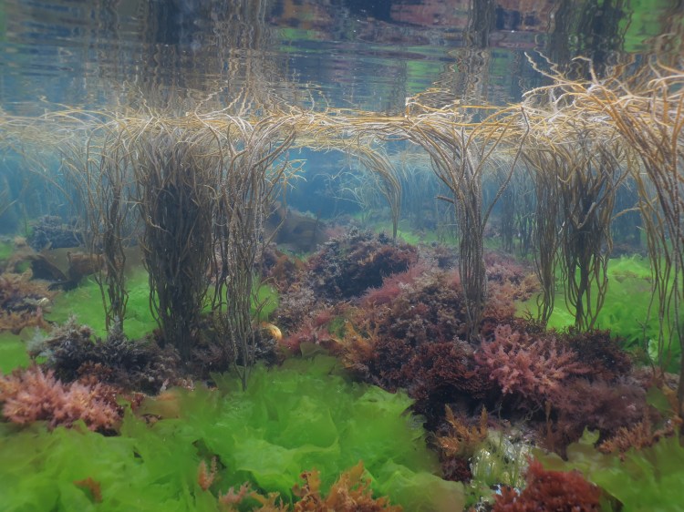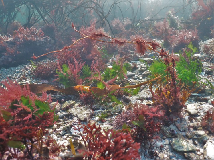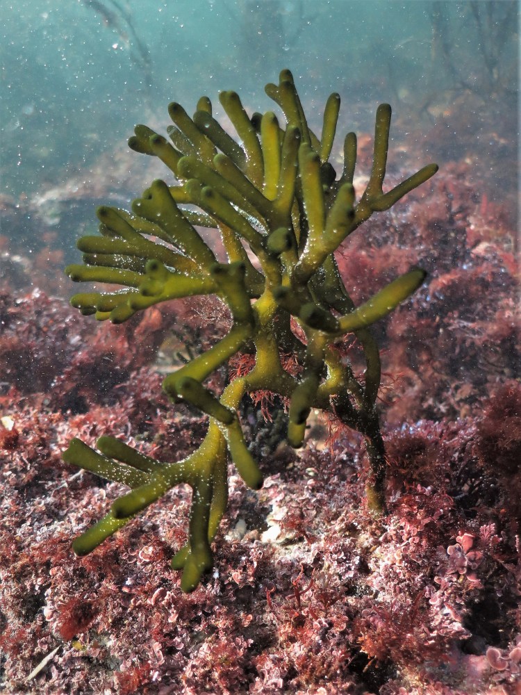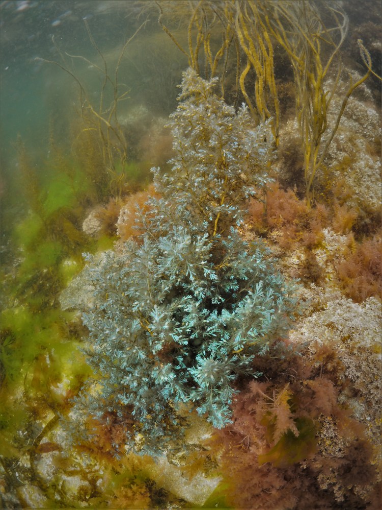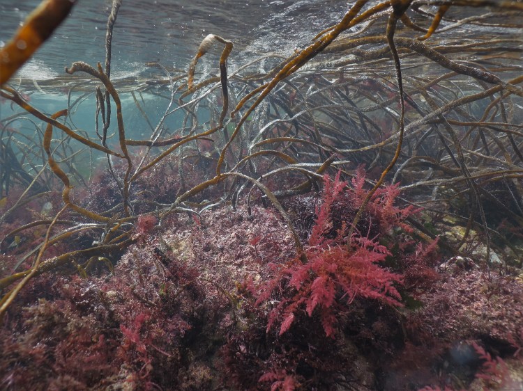 One time, when the tide came in, the water was super oxygenated, and all surfaces were covered with small silver bubbles which was beautiful (and annoying as the camera lens was also covered). The following photos show a very different looking Codium fragile, C. tamariscifolia overgrown with Sea beach Delesseria sanguinea and more Thong weed.