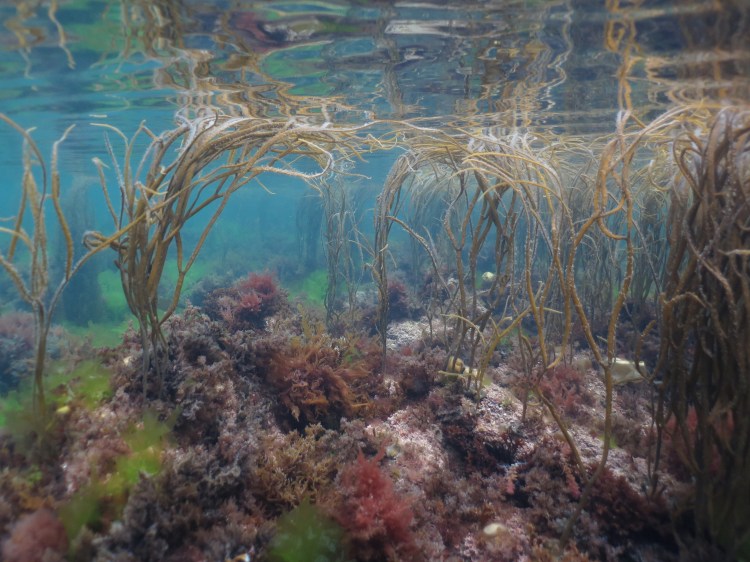 The photos above and below illustrate the state of the rock pools at the moment: quite brownish with the Sargassum and Himanthalia growing everywhere. The red, pink and purple species have largely disappeared (apart from Harpoon weed) and there is quite a bit of green Ulva growing. The water teems with juvenile pollack in the rock pools and schools of sand eels a bit further out. Diving over sandy patches, you can see the latter species shooting out of the sand en masse. It is crazy how such a silvery pelagic fish can also burrow in the sand. I guess it does take its toll, as there are quite some dead ones to be seen too.