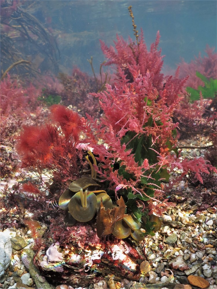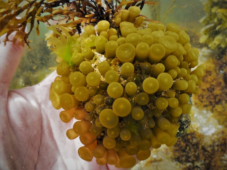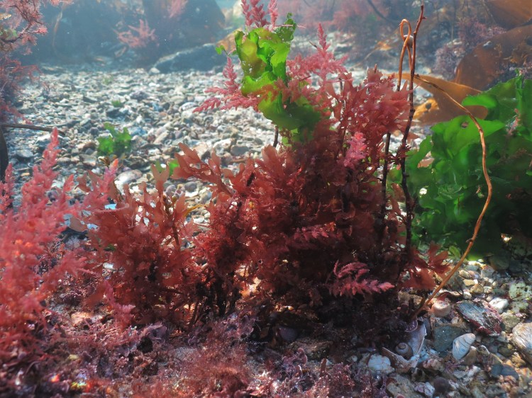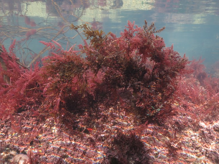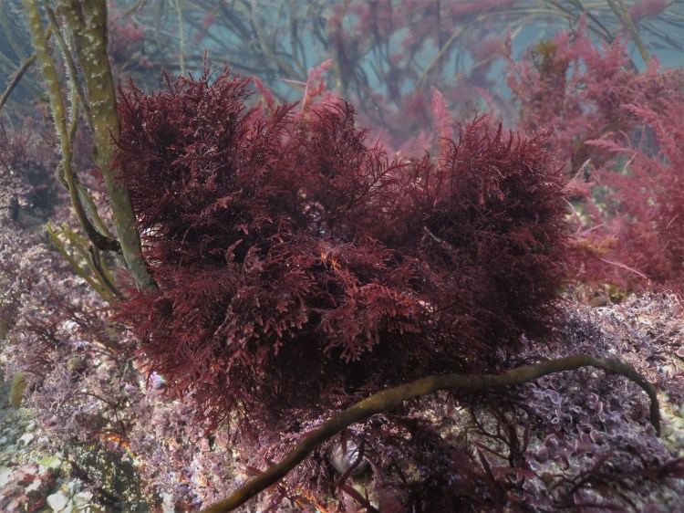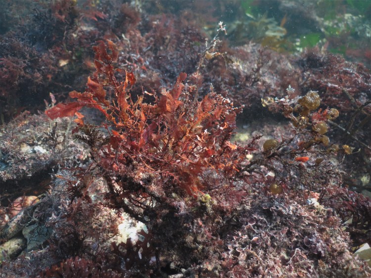 Some other seaweed species were present as well; Irish moss and Harpoonweed (not pictured), False eyelash weed Calliblepharis jubata occurred in multiple patches, Rhodophyllis divaricata?, an Osmundea species and Red grape weed Gastroclonium ovatum. There were also a few brown seaweeds, the characteristic Thong (or Spaghetti) weed Himanthalia elongata buttons and the invasive (and pervasive) Wireweed Sargassum muticum.
