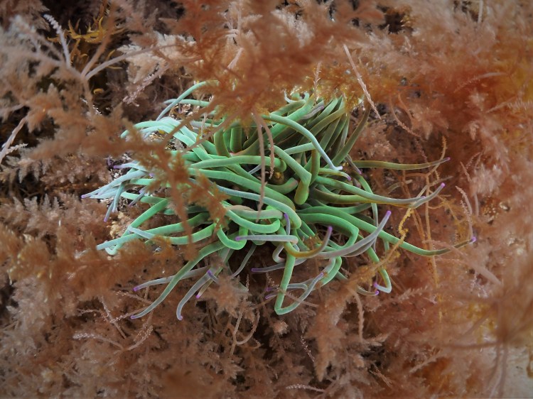 The Flushing snorkel site is very different, no (deep) rockpools, only a little bit of kelp but with a very healthy patch of seagrass. No catsharks or thornback rays when we went in, just the odd small sea bass. There are many small Snakelocks anemones on the seagrass. I used to think that it was mostly the purple form that did this but I now noticed that most were the green variety, so the morphs do not seem to differ in this respect after all. One anemone had ‘caught’ a crystal jellyfish (an Aequorea medusa). Not sure if it was in the process of being digested or just ‘stuck’.