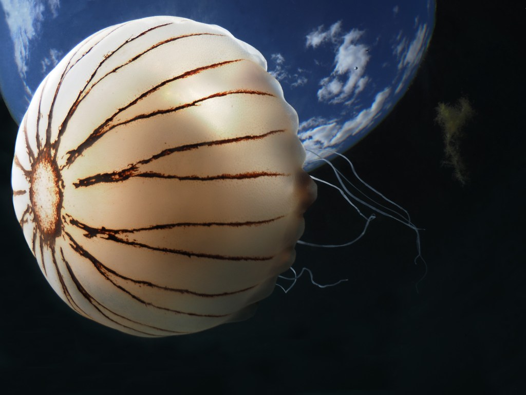 It is the time of year where the rock pools look less attractive (for an example see this old post) and jellyfish appear in the sea beyond. As they are pretty and slow moving, they make for excellent subjects and so I have ventured out over the kelp recently to look for them. I now have a reliable INON D-200 strobe (actually I have two such strobes, it is just that the second arrived 6 weeks ago but not its fibre optic cable…) which makes a huge difference in the types of shots you can take. Photos taken using natural light only can be pretty (see for example here for previous attempts) but a strobe just opens a whole new range of possibilities. I was quite pleased with myself with the shot above of a Compass Jellyfish that seems to float in outer space. Here, the strobe lights up the jelly (which is really close in front of the camera) but it cannot light the ocean behind. Using a fast shutter speed, the ambient light (that would make the water blue) is not let into the camera, resulting in a black background. An exception is the bright sky, which is visible in Snell’s Window, and which looks a bit like a planet against the black background. Of course, even with using a strobe you can choose to let in ambient light, leading to more conventional shots such as the one below (however the jellyfish is a bit further away and not very nicely lit up by the strobe):