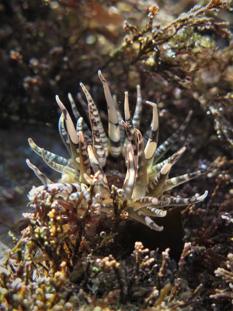 Along with Shanny’s, juvenile Montagu’s blennies Coryphoblennius galerita are very common here (larger individuals must move to deeper pools lower on the shore). I only saw fish between 1.5 and 2.5 cm, tricky to photograph, I need a macro lens! Looking more closely, this tiny pool harboured snakelocks anemones alongside the beadlets, as well as a tiny Gem anemone Aulactinia verrucosa.