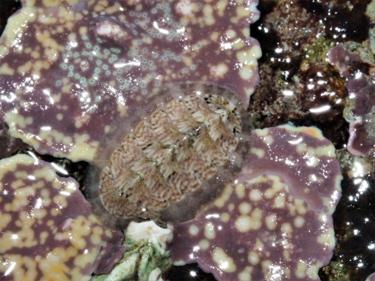 Below are some favourite underwater macro shots (the best pics I also post on instagram). Macrophotography I find easier, as the camera settings remain quite invariable (small aperture with a short shutterspeed because of the flash) and the composition is often (but definitely not always!) simpler compared to shots of say an entire rockpool. First some taken snorkeling in rockpools. The first is a Chink shell on Bushy rainbow wrack. The iridescent nature of the seaweeds means it is bright blue or purple viewed from one direction, but a dull brown from the other. If you get it right, it makes a very striking background and it is definitely a subject I want to explore more. After that, detail of the tip of a Spiny starfish, a European cowrie and a pill isopod.