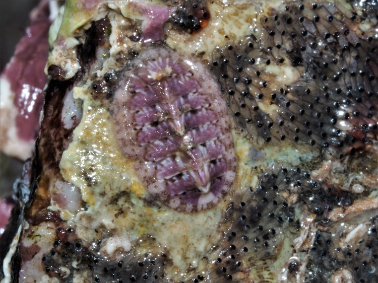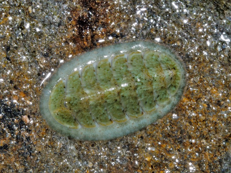 Above a flat worm (check the eyespots!) and a Thick top shell Phorcus lineatus. A main problem is that all subjects are covered with a film of water, resulting in glistening highlights when using the flash. Another issue is the shallow depth of field. The next time I might try to do some photo bracketing/stacking, merging images of a different focal depth (I need a tripod for this). The great thing is that there is no shortage of subjects: turning over a single rock can reveal multiple species each of echinoderms, molluscs, crustaceans, bryozoans, worms, flat worms etc. Below a selection of chitons, I have not had time to check out which species; there are not that many here but they are tricky to identify from photographs. I will check Ian Smiths fantastic photo resources on flickr to do so.