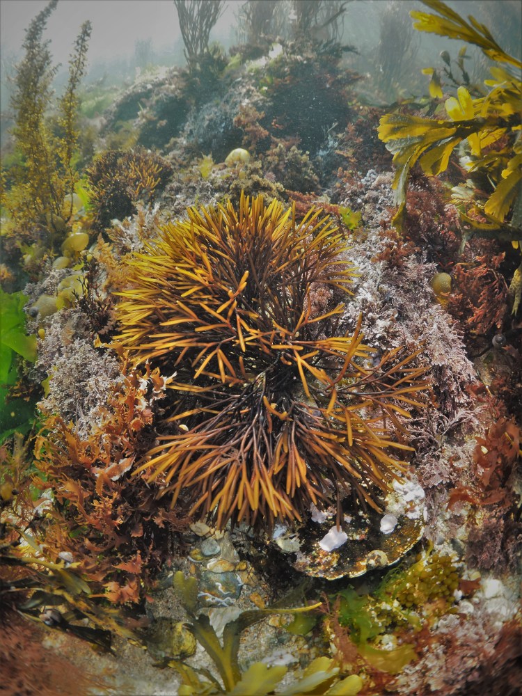 Yesterday I finally took my new camera underwater! I should have gone a bit sooner, but too be fair the water has not been looking very clear (and the viz was still not ideal). The sun was shining and it was great to be back in the water (perhaps 12C, not too cold with a wetsuit). It should be a great experience to shoot with a new, better camera, but it ended up being a bit of a frustrating experience not finding the right settings (I know, first-world problems!). I was stuck in Aperture Priority mode, which was a problem with significant wave action and the need for a fast shutterspeed. Although I took close to 200 photo’s, only a handful were halfway decent. Still, I learned a lot for next time. I took the 8mm fish-eye lens which allows you to get very close to the subject (especially useful for water that is not crystal clear) and still get a wide angle view. Above, a photo of an estuary sponge and seaweeds as well as Snell’s window. Below a badly composed shot of seaweeds, a downward shot of Furcellaria lumbricalis seaweed and Bushy rainbow wrack with Spaghetti weed in the background. All not very sharp and with flat colours, and hopefully standing in stark contrast to the next batch of photo’s!