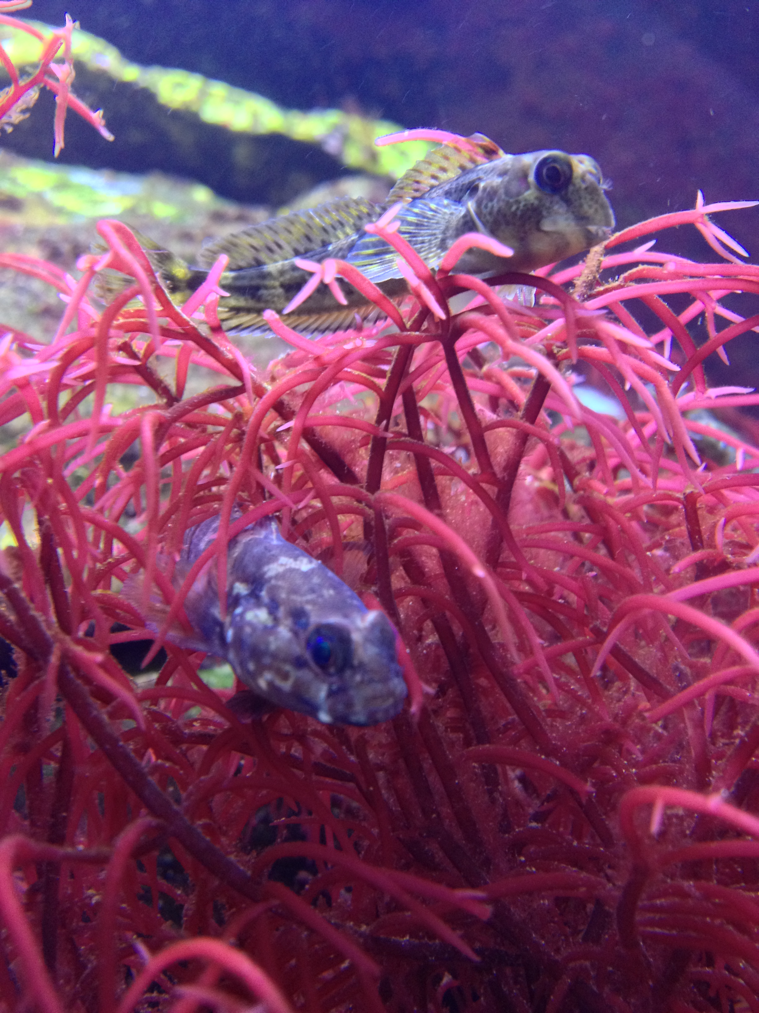 IMG_0203Shannies are probably the most common fish to find in rock pools. They are very easy to keep, their coloration is not particularly vivid but not dull either and they are quite active. The only downside is that they prey on molluscs and other small critters. Feeding them a bit more might prevent this, but especially the rock gobies are so voracious that I doubt that (one was so swollen I thought it was dying, until I realized that it had gorged itself on defrosted artemia…). Montagu’s blenny Coryphoblennius galerita is prettier and smaller than the shanny but much harder to find (see this post for experiences with other fish species).