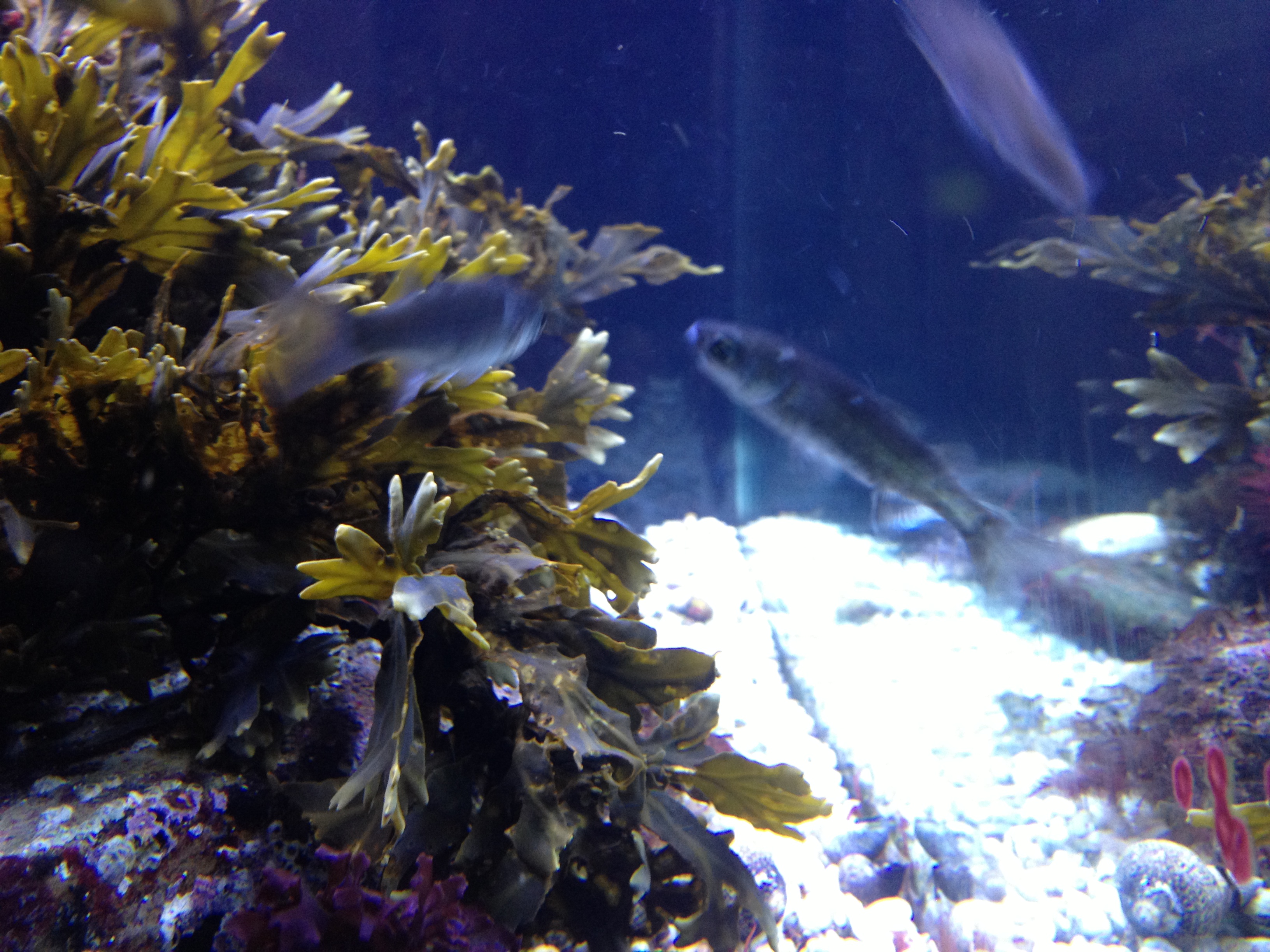 Most rock pool inhabitants live on or near the rocks, but it looks nice if the aquarium also have some fish swimming in the water column. Mullet are very common, and small individuals form nice silvery schools (which are almost impossible to photograph as you can see). They don’t really interact with the other tank inhabitants.
