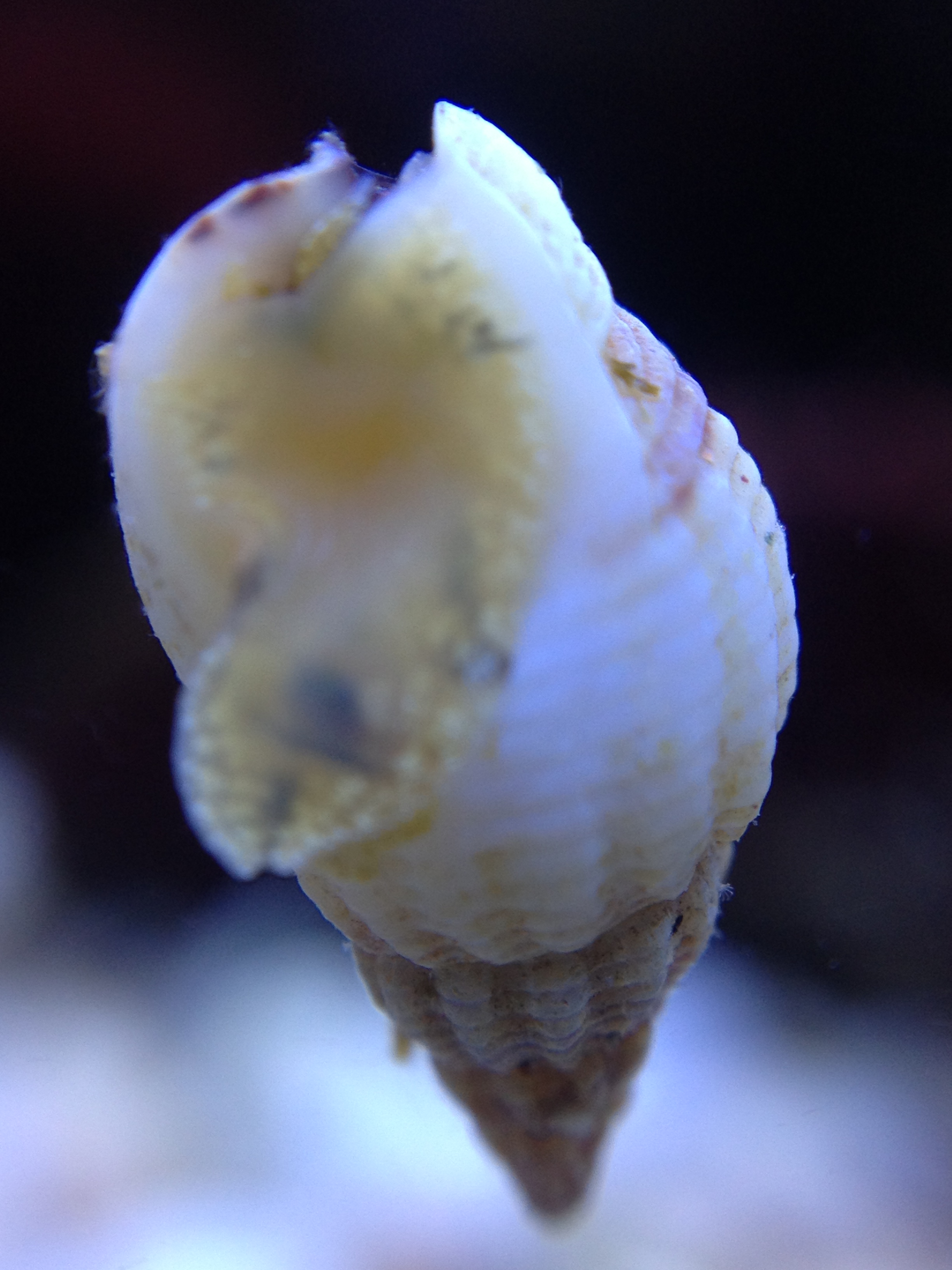 The main problem I have is the dreaded return of algae…There is quite a diversity of them: fuzzy green ones, darker green blotches, slimy purple ones, brown diatoms and more. All interesting organisms surely but I do not want them to take over the tank! I have used food sparingly and used the skimmer most nights, but now have also removed my daylight lamp, to leave a single actinic lamp (see this post about lighting). I still have to get used to this new look, but less light must surely help. Most interestingly, I have enlisted the help of 80 or so grazing snails. Mainly the Common periwinkle Littorina littorea and the Flat top shell Gibbula umbilicalis but also some other species, including two very small Painted top shells Calliostoma zizyphimum. I never had many snails in my aquarium, as they were always eaten by Shannies, but hopefully they will survive this time. I will dunk in a lot more snails, and keep an eye out which species does best. A Flat top shell (picture taken using my olloclip macrolens for the iPhone):