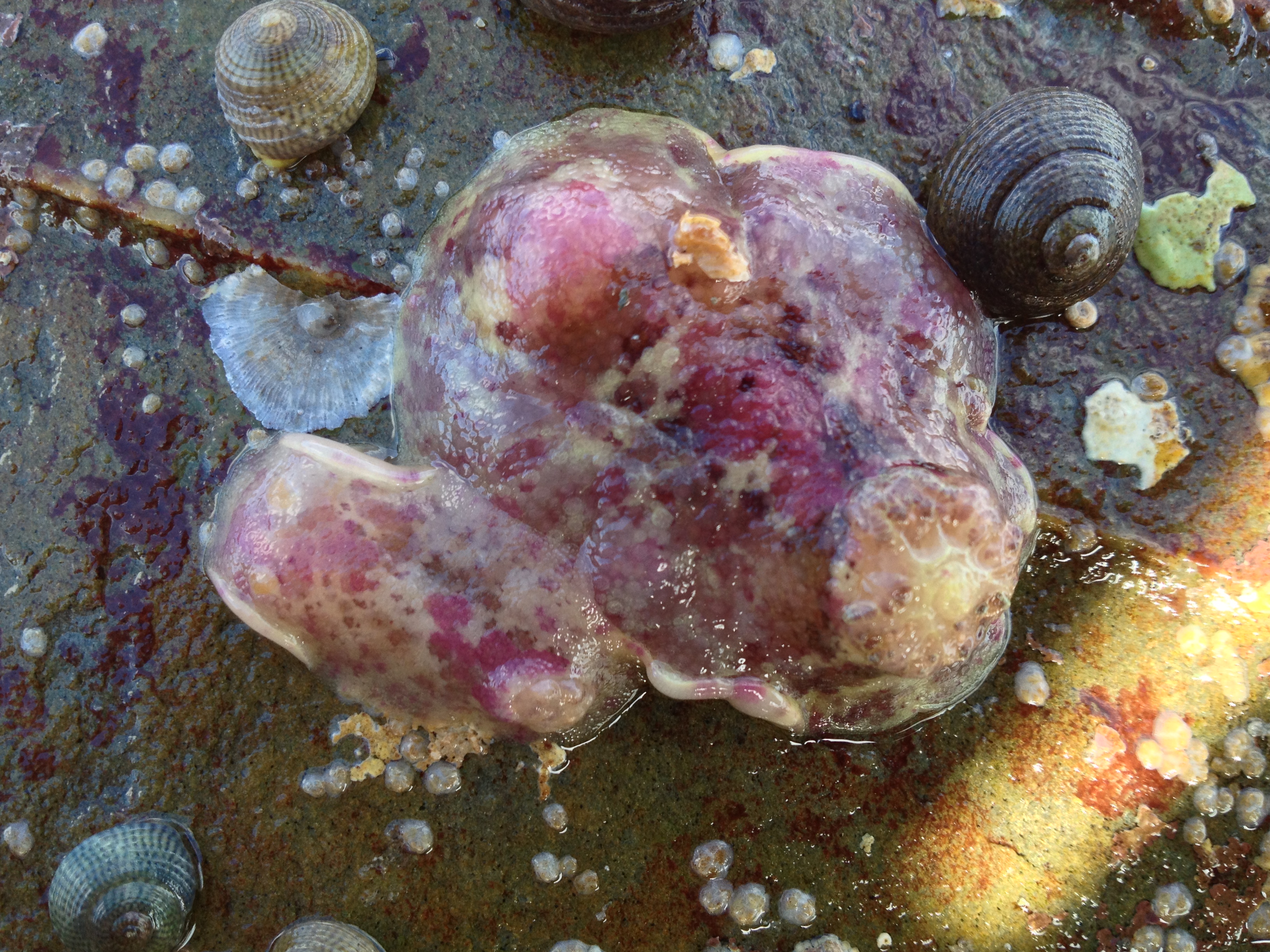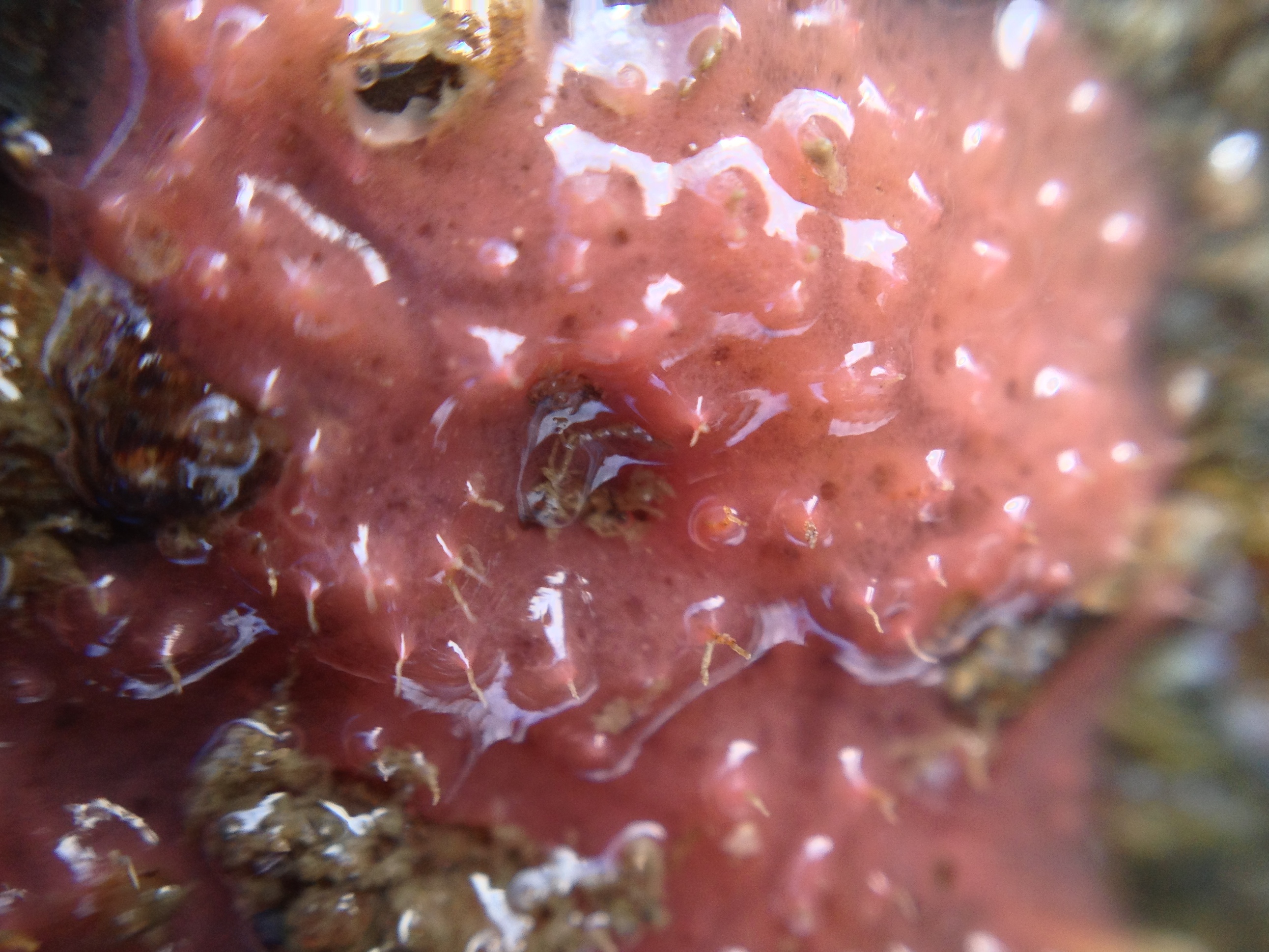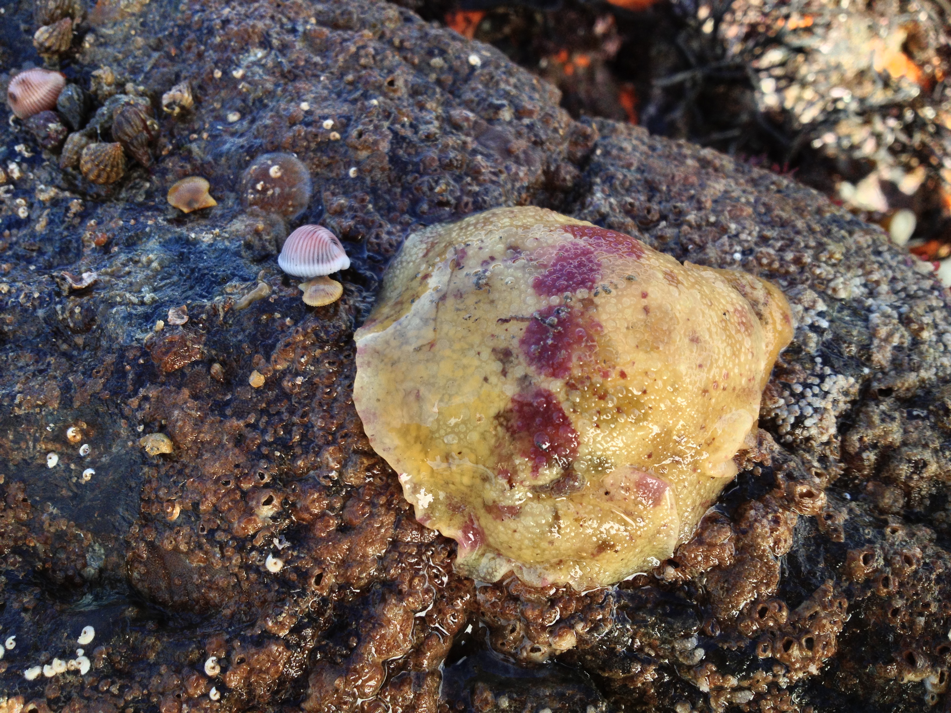 IMG_8041I had seen one before, but with this low tide I found several Sea lemons Archidorus pseudoargus, large sponge-eating nudibranchs. A large one and a small one together (on the right side of each you can see the ‘naked gills’ which are not extended above water):IMG_8098