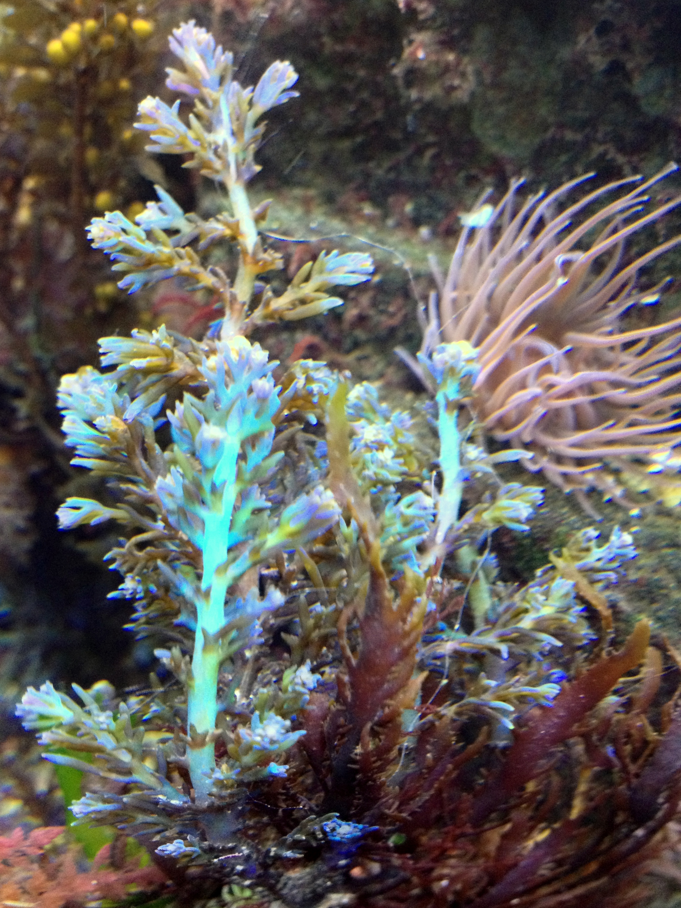 I reckon this has to do with the light spectrum not being right. The colors are reminiscent of the Jade vine from the Philippines. Its coloration is the result of two pigments, malvin and saponarin, being present at a specific ratio at a specific alkalinity (wikipedia again). Both Jade vine and Bushy rainbow wrack seem to be fluorescent to my non-expert eye, although a quick search on google did not give me anything on fluorescent plants. Anyway, I will make it my goal in life to find the light conditions that bring back these colors!