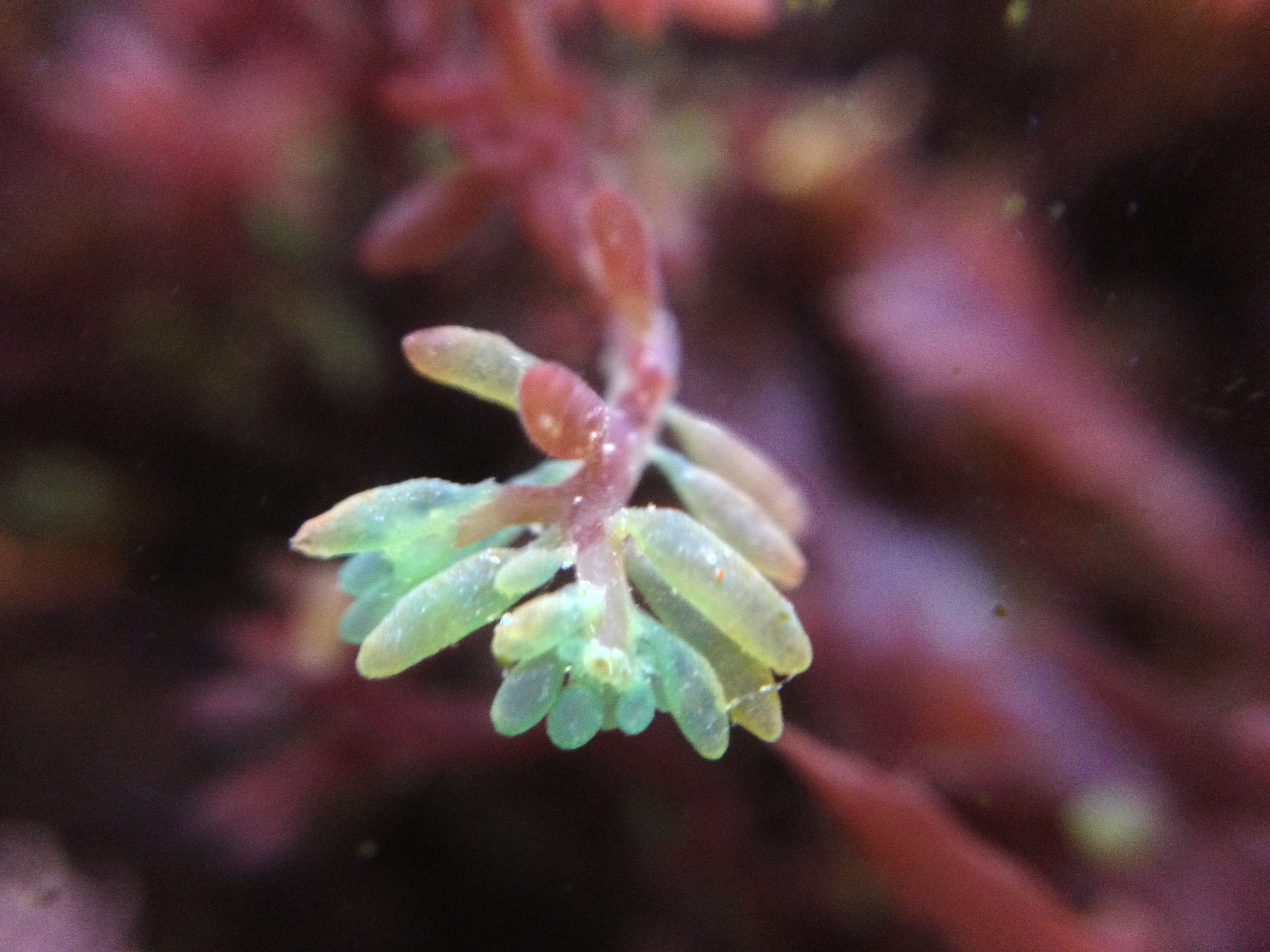 I next noticed that the branchlets of the Red grape weed turned from a dark purple-brown into a fresh green. Although pretty, that this was not a change for the better was obvious when upon touching the plant many of the branchlets were shed. I removed this plant before this debris would clog the filter.