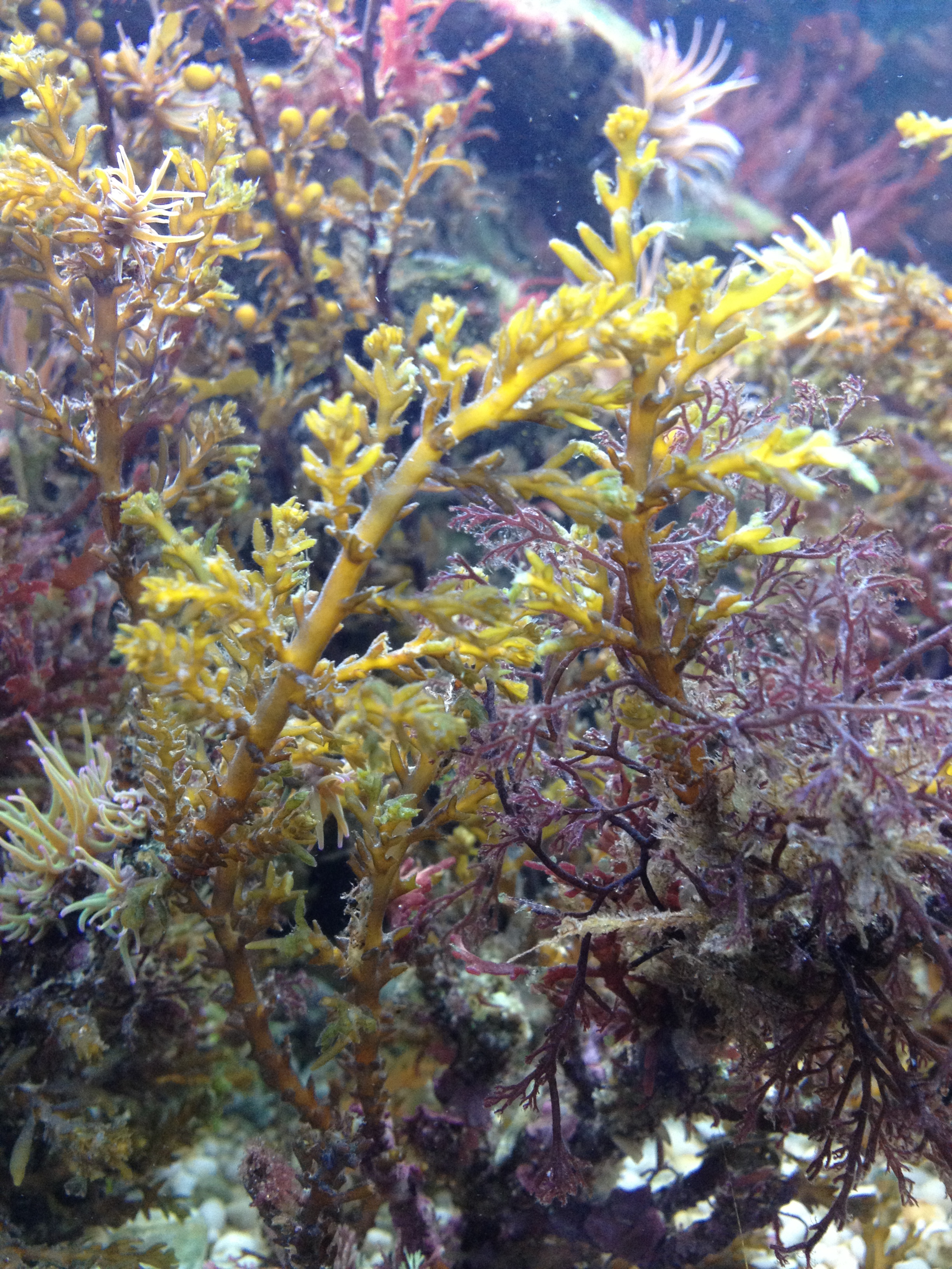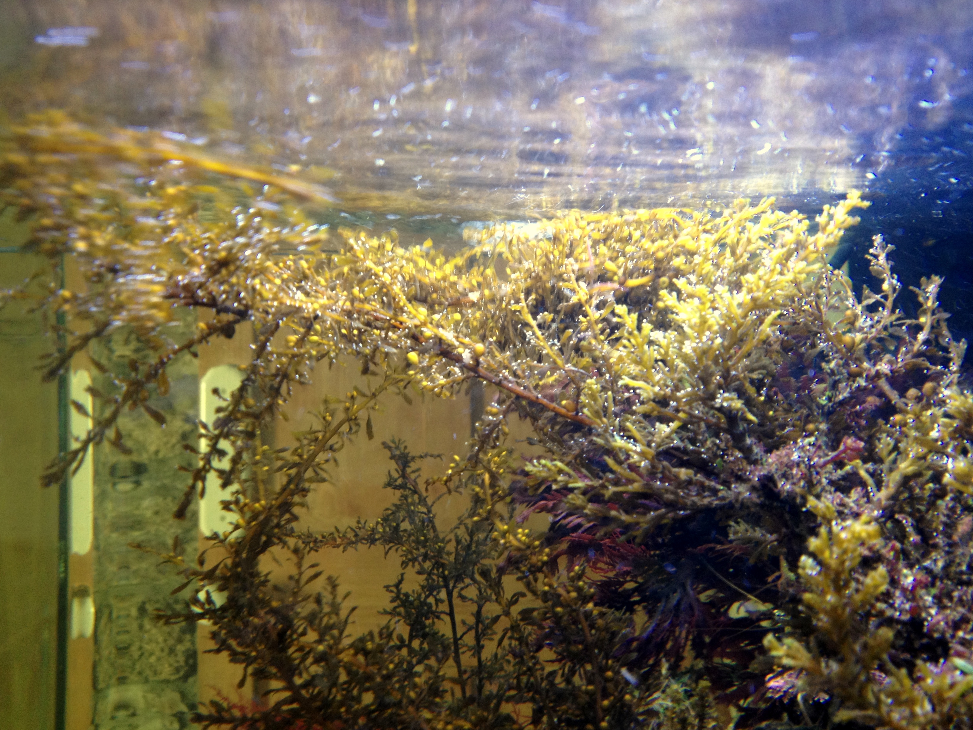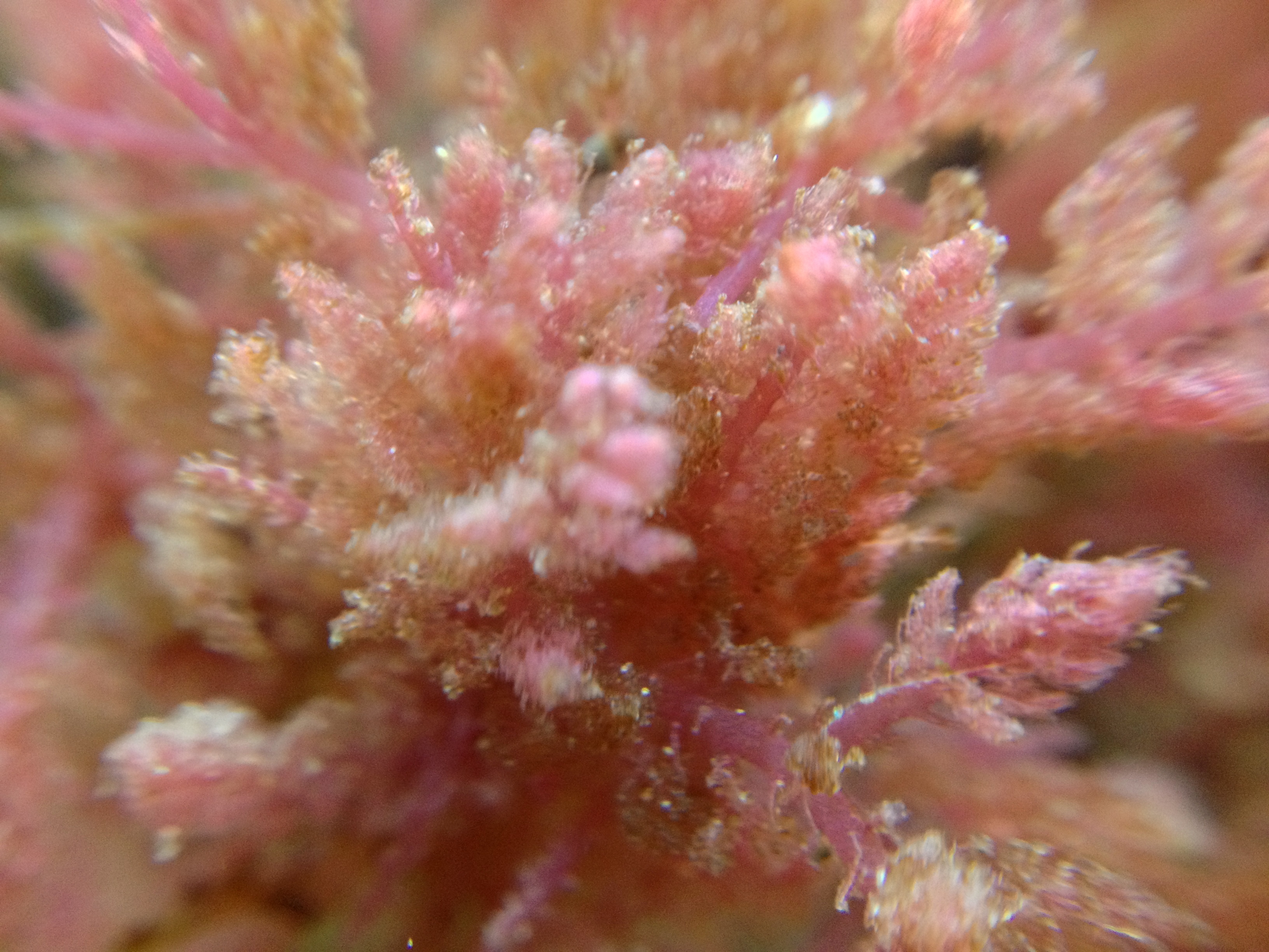 It does not look like much but taking the time for a carefully look was really rewarding. It is tricky to take photographs without being able to see the viewfinder though. My strategy has been to just take loads of pictures and hope some of them work out. The miniature underwater landscape was really beautiful. Pink plates Mesophyllum lichenoides made up the largest proportion of corraline algae (some bearing ‘reproductive conceptacles’). Another species is Corallina officinalis or Common coral weed (third photo). I had some Corallina growing in my aquarium at some point, but it grew very slowly and has now disappeared. Being able to create the right conditions for coralline algae to thrive in a coldwater aquarium would be fantastic, but I have not seen any evidence of anyone being able to cover their aquarium in them yet. (I have tried ‘planting’ Corallina and although it looked very nice at first (fifth pic), these seaweeds quickly died off, turning orange and then white (second pic).)