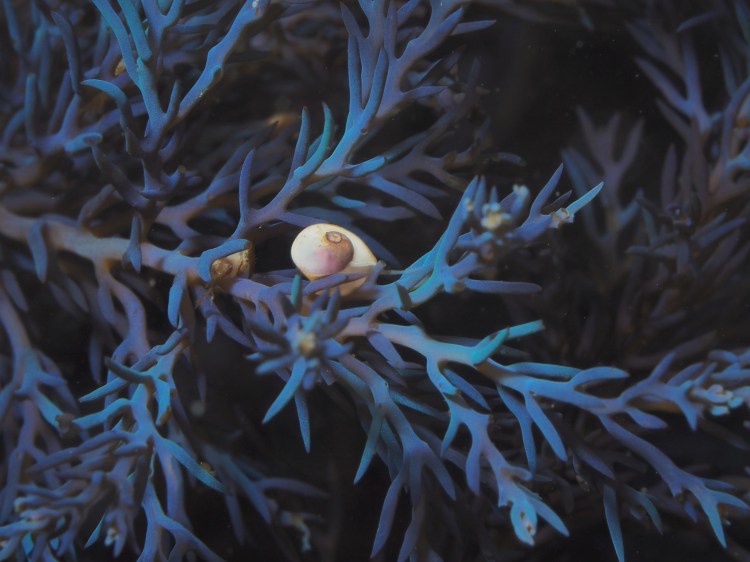 Another difficulty is working the strobe. Unlike the ‘normal’ ambient light photography I am used to, the image after clicking is different from that seen through the viewfinder so it is trial by error. Often the subject is not properly exposed. Also, floating particles cause backscatter. Perhaps I should try a snoot to minimise this effect, which can ruin an otherwise decent (in focus) photo, like this one of a Stalked jellyfish Haliclystus octoradiatus which are common at the moment. (Notice the tiny molluscs on the seaweed in the background.)