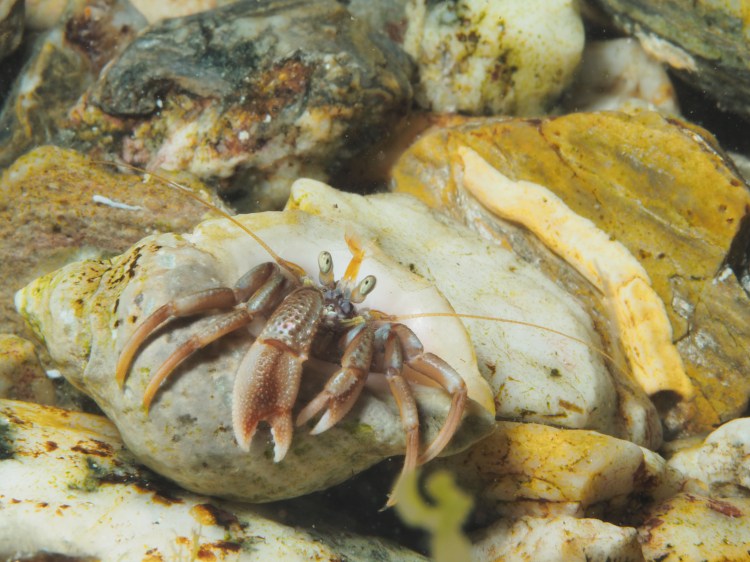 To give an idea of how tiny some things are see the photo above of the shell-less mollusc Runcina coronata (this is an ophistobranch, it does not have gills on its back as do nudibranchs), it was really, really tiny! This photo is nice for ID purposes but I do not expect I can take good photos of species this small (you reallly need an additional macro wetlens for that). I only later noticed the even smaller mollusc Flat skenea Skeneopsis planorbis next to it. (I identified this species using the excellent new Essential Guide to Rockpooling by Julie Hatcher and Steve Trewhella by the way, highly recommended!). I also noticed I need to clean my finger nails! (More tiny molluscs were present, including Eatonina fulgida.) Next, the mollusc Tritia reticulata (which I knew under the names Nassarius reticulatus or Hinia reticulata….) or Netted dog whelk in common parlance. These are very active and fun animals. The macrolens really brings out how battered and overgrown the shell is and the beady little eyes also stand out. A little hermit crab posed nicely as well.