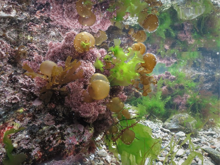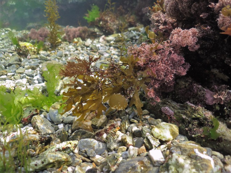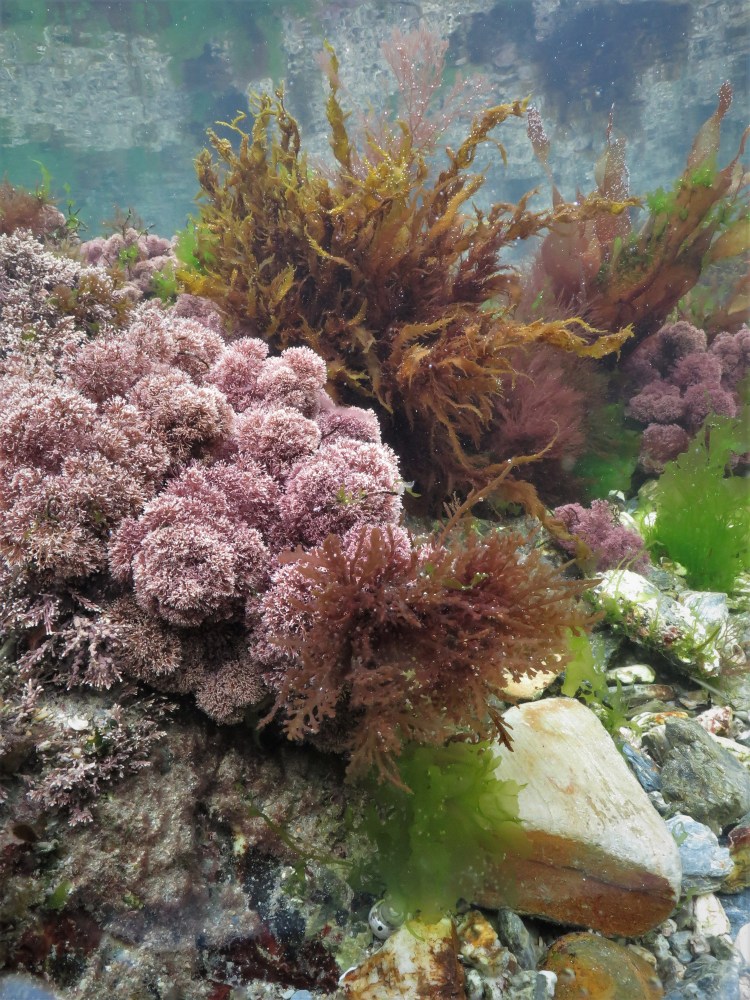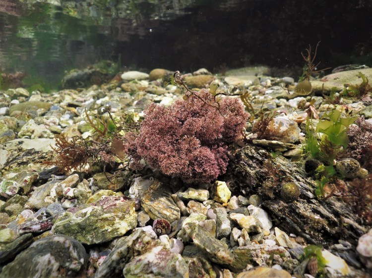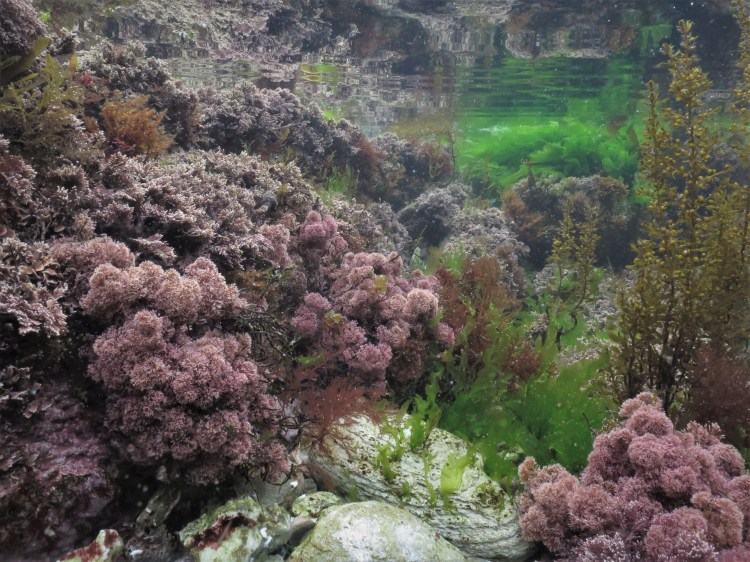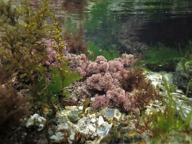 By the next snorkel session the 19th, the visibility was much better. Some photos of the green seaweed Codium sp., A Gelidium sp. (pulchellum?) and a patch of Slender-beaded coral weed Jania rubens growing epiphytically on Hairy sponge weed Cladostephus spongiosus with the very common species Ulva and Oyster thief Colpomenia peregrina (and others). Next, Beautiful Fan weed Callophyllis laciniata and another Berry wart Cress Sphaerococcus coronopifolius.