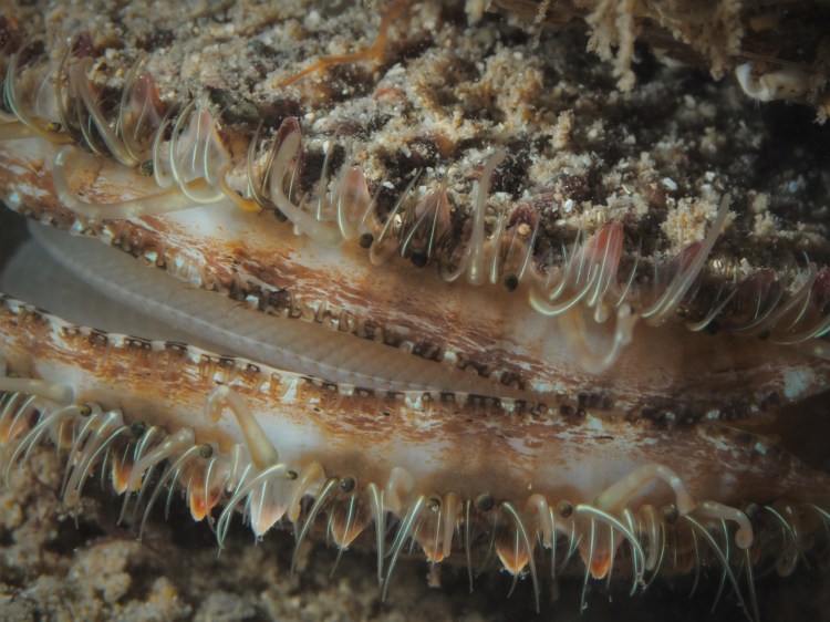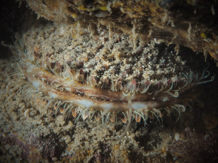 I have not posted a lot this year; in part just because I have not been out as much as I hoped I would, and in part because I had some technical difficulties (I had to sent back a malfunctioning strobe and am also having snoot troubles). As a result I have not gone scuba diving and did not see much of the rock pools either. I managed to take some macro shots over summer though that are worth a quick post. Above a Cushion Star Asterina gibbosa on a colony of the star ascidian Botryllus schlosseri. Below one of my favourite little molluscs, the beautifully patterned White tortoiseshell limpet Tectura virginea. Another tiny mollusc, is the Needle Whelk Bittium reticulatum. The Variegated Scallop Chlamys varia is also common (under rocks) and can be nicely patterned when they are small. Finally some other tiny critters: the Flatworm Leptoplana tremellaris (I like their beady little eyes) and the Bryozoan Disporella hispida.